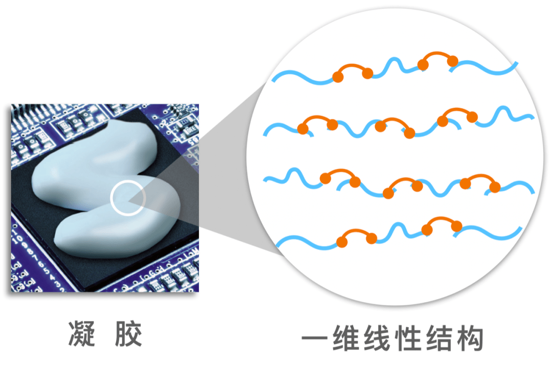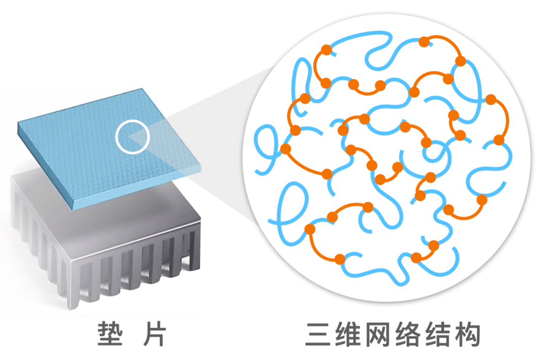 如果把导热垫比作一个房子,那么硅油小分子就是盖房子用的砖头;而“交联剂”则相当于把砖头砌成房子的水泥,它能和硅油小分子的官能团发生反应,把这些短链小分子都连接在一起,形成具有立体网络结构的超大分子集团。