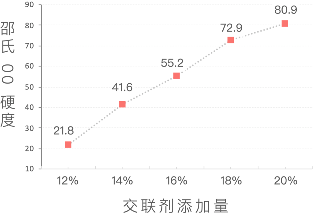 关于这个现象也有研究人员做过实验,他们发现当交联剂的添加量增加8%,导热垫片的硬度就会从(shore 00) 21.8一下子飙升到80.9。(低挥发超柔软高回弹有机硅导热垫片的研制_叶恩洲)