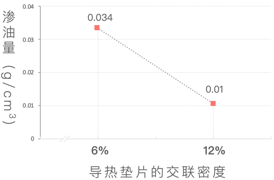 的确如此,有研究人员就按照这个思路做过实验。发现在相同条件下,交联密度12%的导热垫片的渗油量,要比交联密度6%的垫片少了240%。(导热有机硅复合材料的制备与应用性能研究_王亚龙)