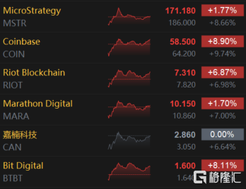 格隆汇5月13日丨区块链概念股盘前走高,Coinbase涨9.74%,MicroStrategy涨超8%,Marathon Digital涨7%,Riot Blockchain和嘉楠科技涨超6%,Bit Digital跟涨。比特币、以太坊日内反弹超8%,重上30000美元和2000美元关卡。