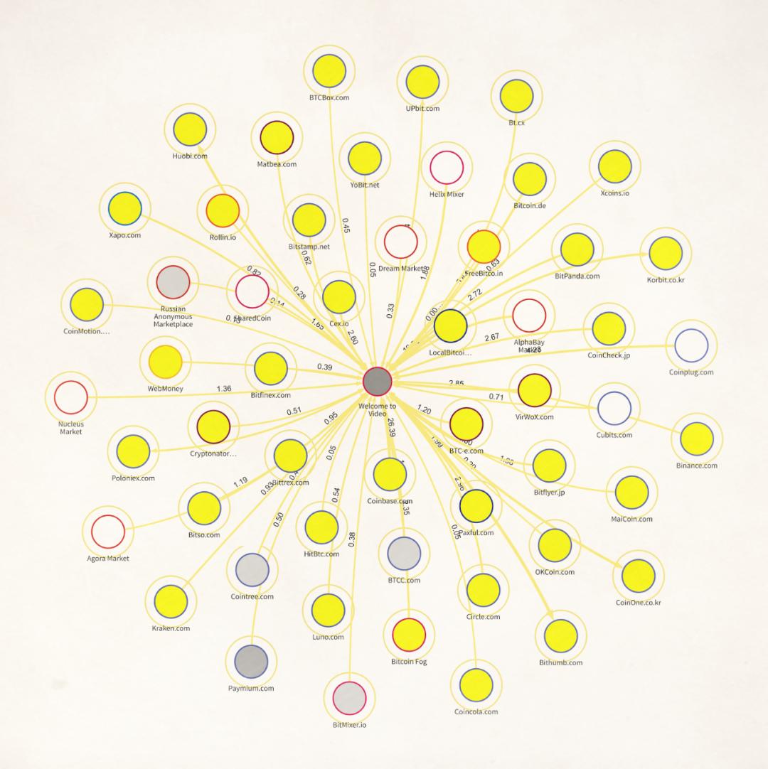 看到这你就明白了,“比特币显影液”,恰好可以对付 Welcome to Video 这样用比特币交易的暗黑网络。这位站长以为给每个“会员”发不同的打款地址就可以把他手里那个真实的账户隐藏起来,但他显然天真了。在莱文的指导下,NCA 特工用“显影液”画出了这些比特币账户之间的“关系地图”。在最终的图上可以看出,有几千个比特币地址曾经向一个“终极比特币地址”打款,转账记录密密麻麻,就像千万只蟑螂在这片肮脏的地区爬行。