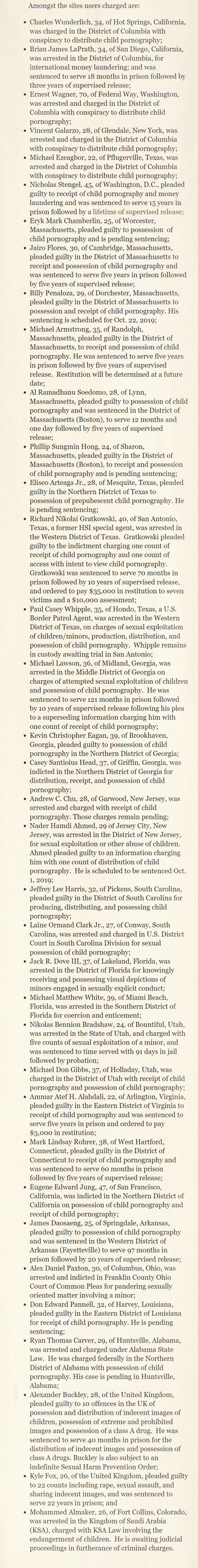 一些犯罪嫌疑人的头像在其他国家,抓捕的消息也陆续传回来。捷克、西班牙、巴西、爱尔兰、法国和加拿大,都有几十名嫌疑人被捕。在整个案件缘起的英国,NCA 特工们逮捕了一名26岁的男子,冲进他家时,正有一名儿童赤身躺在床上。匈牙利,在一位匈牙利驻秘鲁大使的电脑上,发现了19000多个儿童虐待图片视频,他被悄悄地撤职,回到匈牙利,默默受审,认罪。在美国探员看来,这些嫌疑人还有一个特别的结局,那就是“不知道结局”。一位沙特籍的男人在回国后,被沙特警察局逮捕,但随后如何处置,就没了消息。(伊斯兰教法大概会对性犯罪者施以鞭刑或砍头。)还有一位中国籍的男人,在西雅图逃过了警察的搜寻,特工们估计他回到了中国,然后就消失在特工的视野之外。更让人悲伤的是,一些视频里遭受严重肢体残害的孩子,最终没办法找到,有些孩子的踪迹即便追查到了蛛丝马迹,但却因为证据不足,只能变成失踪悬案。但全世界的特工们确实做到了一些事情:38个国家的警察总共逮捕了337个嫌疑人,把至少23个孩子从危险的境地解救了出来。以下是美国司法部罗列出的名单(点击可放大):
