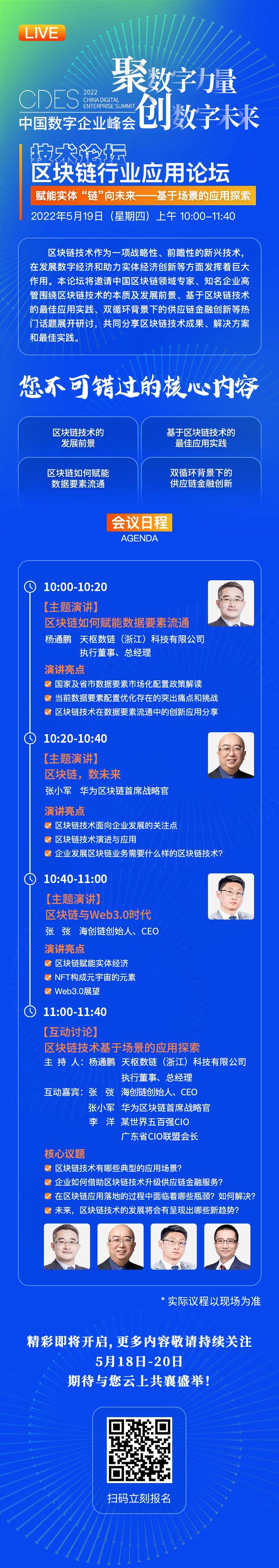 2022中国数字企业峰会“区块链行业应用论坛”将于5月19日上午,与大家相约线上。本论坛以“赋能实体 ‘链’向未来——基于场景的应用探索”为主题,邀请中国区块链领域专家、知名企业高管围绕区块链技术的本质及发展前景、基于区块链技术的最佳应用实践、双循环背景下的供应链金融创新等热门话题展开研讨,共同分享区块链技术成果、解决方案和最佳实践。