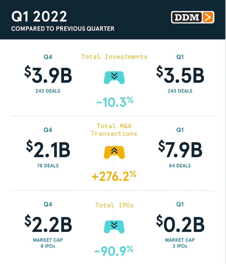 博链财经获悉,5月17日,据福布斯,游戏行业咨询公司Digital Development Management(DDM)发布的电子游戏行业投资报告显示,电子游戏行业的投资交易在2022年第一季度创下35亿美元的新纪录,部分原因是对基于区块链的技术和游戏的兴趣。