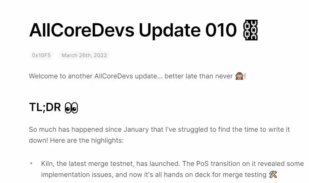 而在3 月 26 日,以太坊核心开发者 Tim Beiko 总结了最新一次的核心开发者会议内容,包括合并测试网 Kiln 进展、难度炸弹、上海升级、以太坊执行层工作进展等等。