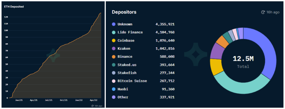 目前,从用户存款余额来看,ETH 流动性质押服务提供商排前两名的也正是 Lido Finance 和 Rocket Pool,其中 Lido 占据绝对优势地位,截至 5 月 16日以超1260万枚的以太坊数量傲视群雄。