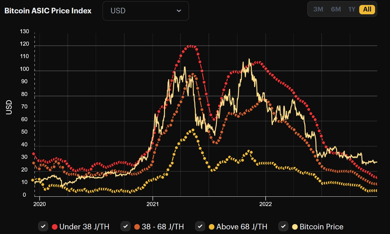 比特币 ASIC 矿工——专为开采比特币而优化的机器——目前以 2020 年和 2021 年以来未见的最低价出售,这被视为加密货币熊市加深的另一个迹象。