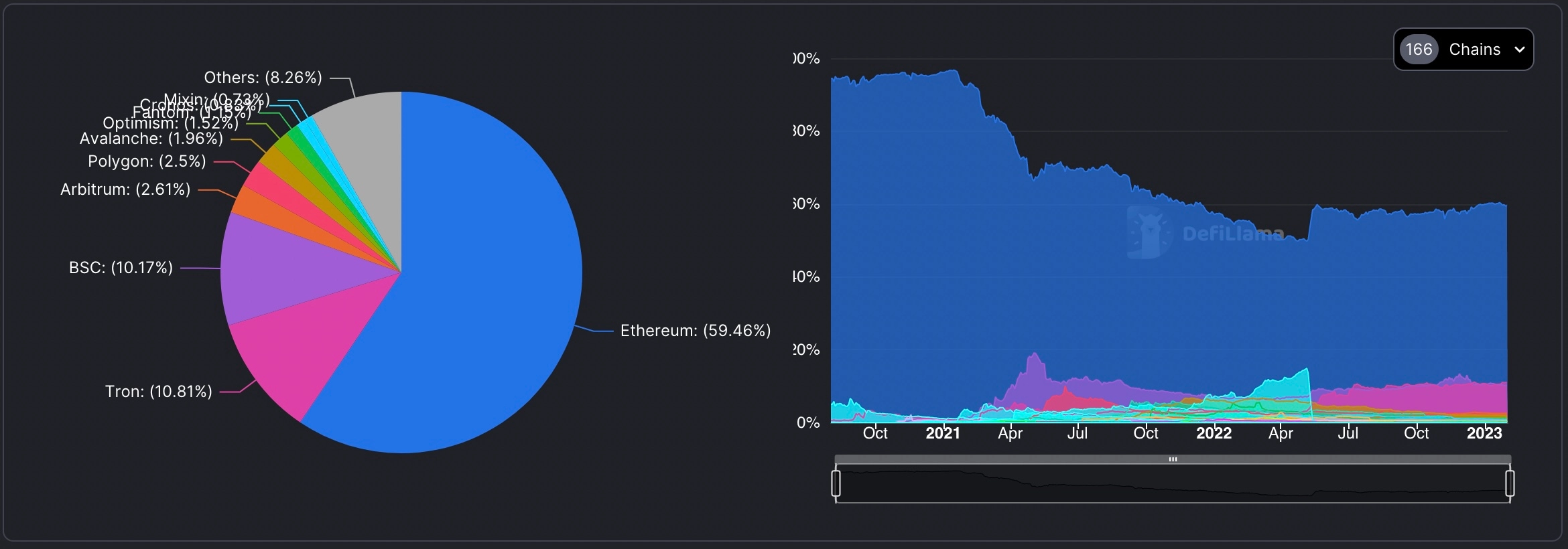 尽管 ETH 是市值第二大的加密货币,但以太坊是领先的权益证明 (PoS)网络。在撰写本文时,它约占去中心化金融 (DeFi)协议锁定总价值的 65%,约为 487 亿美元。