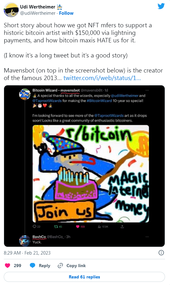 在区块链研究分析师 Udi Wertheimer 和受模因启发的比特币社区 Taproot Wizard 将巫师模因铭刻在比特币上之后,这成为可能,不仅是为了“庆祝他的艺术诞生 10 周年”,而且还为模因的创造者赚取了一些现金,根据 Wertheimer 的说法,“Mavensbot”: