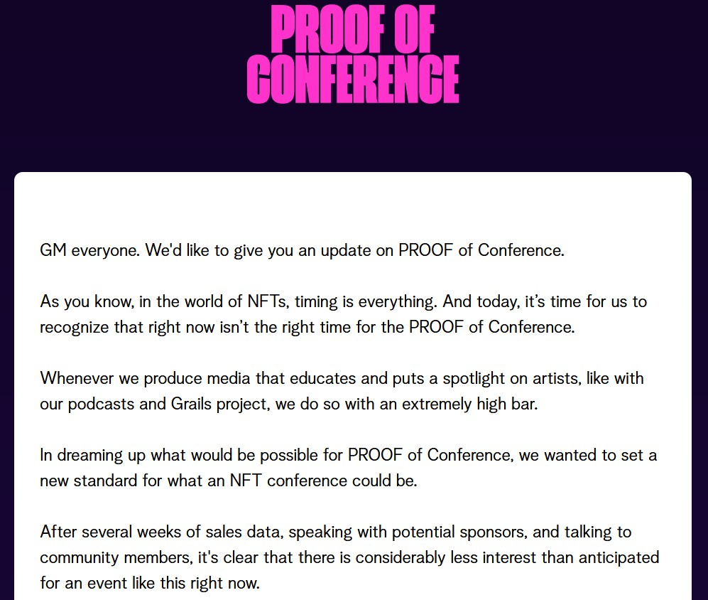 “如你所知,在 NFT 的世界里,时机就是一切。而今天,是时候让我们认识到现在不是进行会议证明的正确时机。”