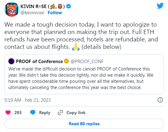 Kevin Rose 和 PROOF 团队关于取消会议 PROOF 的消息。来源。证明。