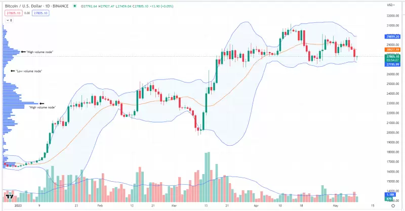 比特币似乎正在进入一个区间,在 27,500 美元左右的支撑位徘徊。可见范围交易量概况 (VRVP) 工具显示 28,000 至 27,400 之间的高水平交易活动。那些“高容量节点”通常代表价格变动可能停滞的区域,因为它们代表买卖双方之间达成协议的历史区域。