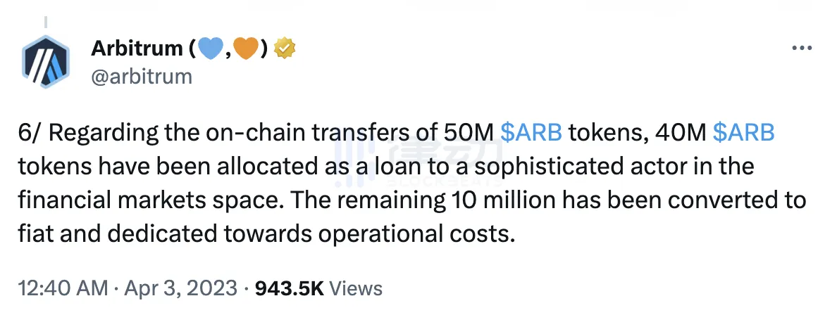 此外,Arbitrum 补充表示,其基金会并没有提前出售 5000 万枚 ARB,其中 4000 万枚 ARB 已作为贷款分配给金融市场领域的成熟参与者,剩下的 1000 万枚 ARB 则被兑换成法币以用于支付运营成本。