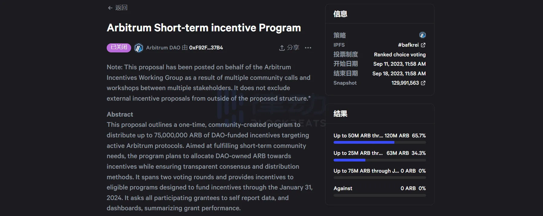 9 月 11 日,Arbitrum 社区发起「向 Arbitrum 生态活跃的协议分发 7500 万枚 ARB 资助激励」提案,该计划旨在满足短期社区需求,计划将 DAO 拥有的 ARB 分配给激励项目,同时确保透明的共识和分发方法。18 日,该提案以 0 反对票计录获得通过。