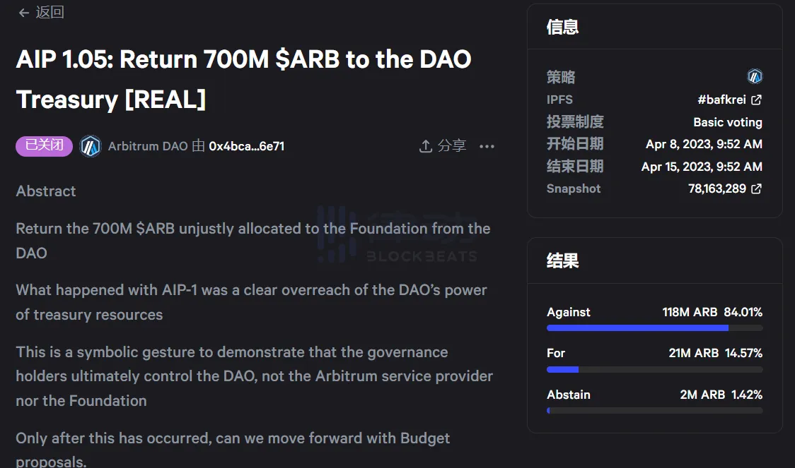 4 月 15 日,据 snapshot 数据显示,Arbitrum「将 7 亿枚 ARB 返还给 DAO 财库」的治理提案未能获得投票通过,反对票共计投出 1.18 亿枚 ARB,占总投票数量的 84.01%。
