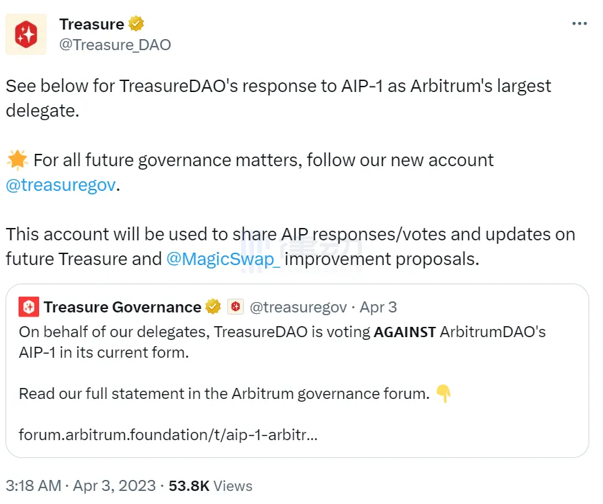 Arbitrum 官方作出回应当天,去中心化游戏生态系统 TreasureDAO 在其社交平台表示,作为 Arbitrum 生态最大治理代表,已对 Arbitrum 基金会提出的 AIP-1 提案投反对票。此外,TreasureDAO 要求 Arbitrum 重新提交一份提案,其中需要更清楚地说明特别拨款计划的范围,并将 AIP-1 提案进行拆分。