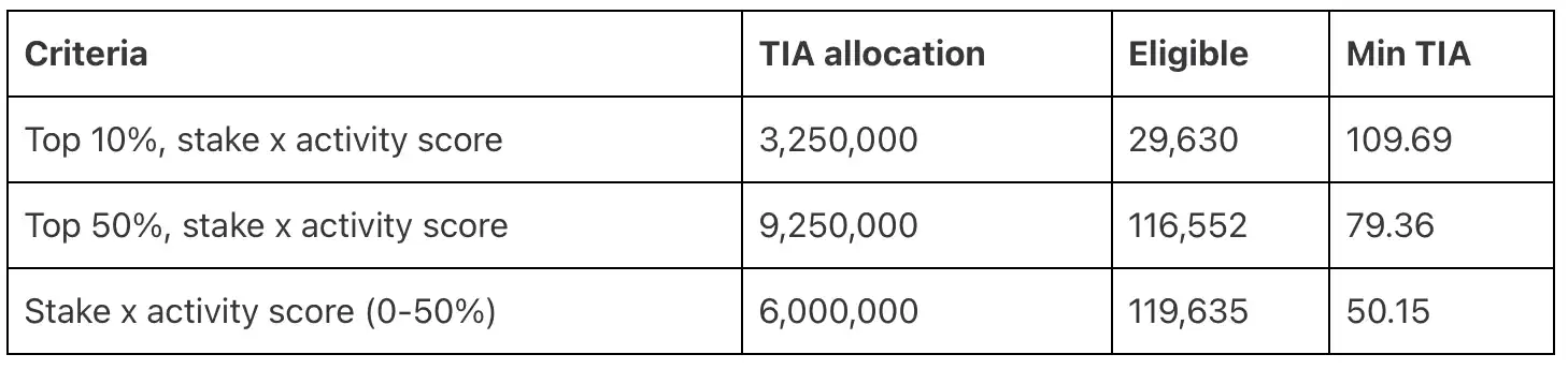 创世空投将 TIA 分配给 Cosmos Hub 和 Osmosis 的持有人和代表至少 75 美元的委托人,邀请他们加入 Celestia 并参与保护和治理网络。为了将更多的 TIA 分配给更多活跃的地址,资格分为三个层次的押金和链上活动,通过将押金和链上活动得分相乘得出。