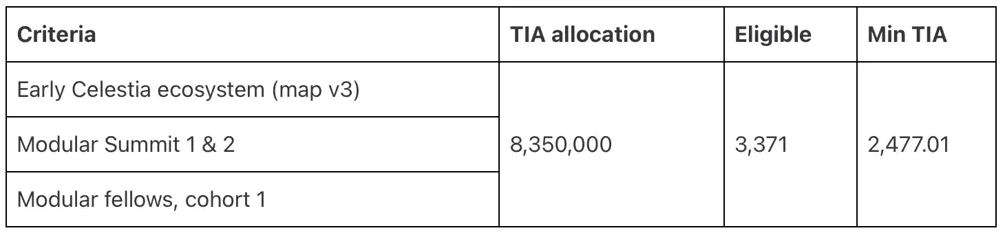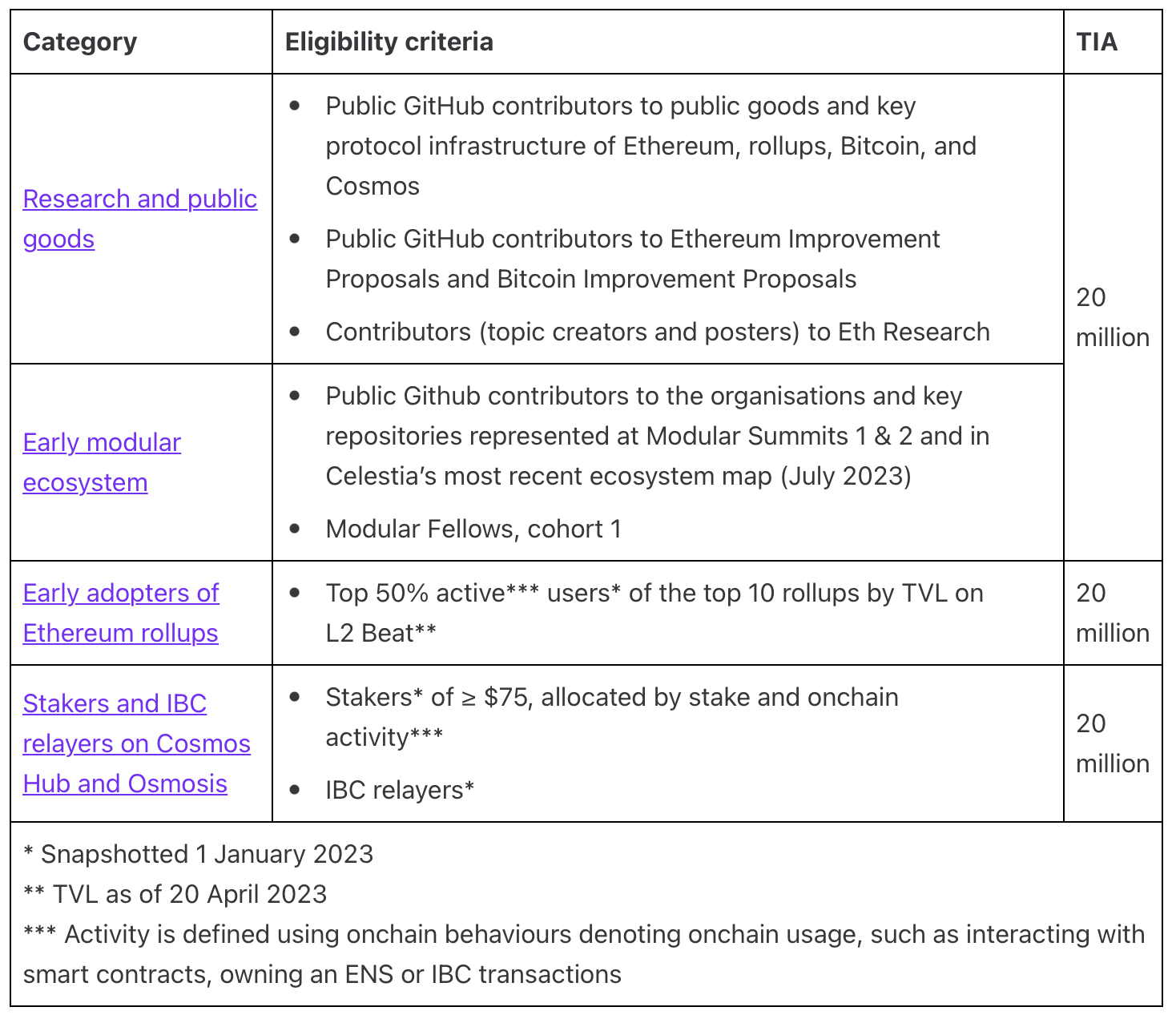 创世空投的资格分为四个类别,其中两个分配 TIA 给 7579 名开发者,另外两个分配 TIA 给 576,653 个以太坊、Rollups、Cosmos Hub 和 Osmosis 上的链上地址。开发者可以符合多个 TIA 分配的资格(例如,研究和公共物品、Eth 研究和/或早期模块化生态系统的总和)。