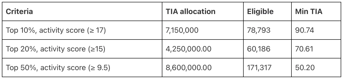 额外的 TIA 分配给在所有合格存储库中总共至少有 4 次提交的 Github 贡献者,甚至更多的 TIA 分配给在研究和公共产品以及早期模块化生态系统标准中总共至少有 23 次提交的贡献者。