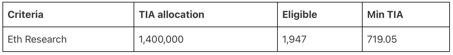 Genesis Drop 向 Eth Research 论坛的成员分配了 1,400,000 TIA,这些成员在论坛上进行了开放性讨论并发布了具有开创性的研究主题或帖子,时间跨度超过六年。