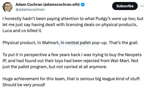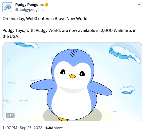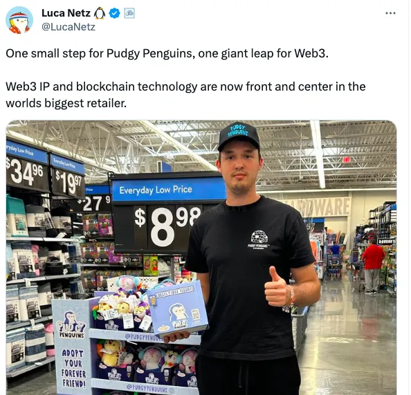 Pudgy Penguins 的 CEO Luca Netz在社交媒体上指出这是「Pudgy Penguins 的一小步,Web3 的一大步。」