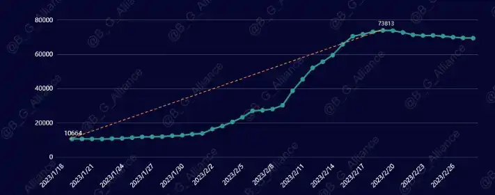2.2 项目方通过联合 KOL 开展 Discord 白名单活动进行用户裂变,可以看到在活动期间 (1/18-2/20)Matr1x 的 Discord 成员数猛增 6.3 万,1 个月的时间完成了 6 倍的体量增长