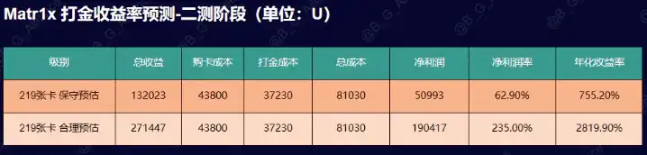 5.1.4 271 张 Pass 卡中有 219 张属于小飞鱼工作室,那么我们就可以测算出来打金回报保守估计在 13 万 U,年化收益率 755.2%