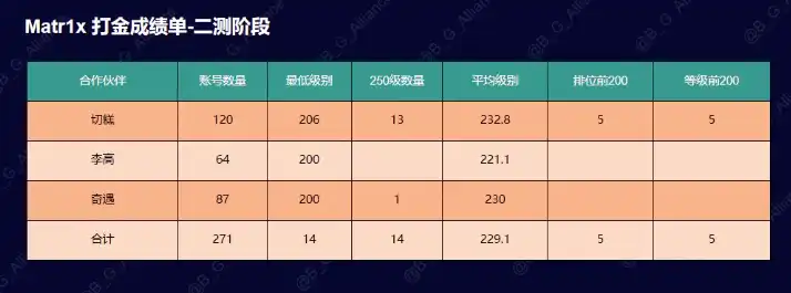 5. 有了正确的策略,再加上优秀的技术管理工具,自然能有一个好的结果。他的工作室及其合作的游戏公会一共负责 271 个游戏账号,交付等级最低在 200 级,平均交付等级 229.1,并且在没有冲榜的执行安排下,也有 14 个账号达到最高 250 等级,5 个账号排入前 200