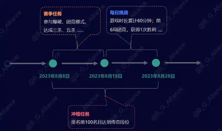 2.2 二测主要的活动任务有 3 个:赛季任务、每日挑战、冲榜任务。赛季任务在第 1 天-第 10 天解锁,都是跟竞技游戏行为相关任务,完成难度适中;每日挑战在第 10 天-第 21 天解锁,每天有一个保底的时长任务,剩余的任务都是「前 X 局团竞,获得 N 次胜利」,富有挑战;冲榜任务难度最高,需要每天在排行榜前 100 名且达到 '传奇' 段位,传奇/Legendary 是游戏内的最高段位