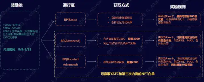 2.1Matr1x FIRE 二测时间持续 21 天,Battle Pass 卡是内测的通行证,分三种等级,持有 BP(Adcanced) 高级款通行证和 BP(Boosted Advanced) 高级进阶款通行证玩家有机会赢取 YATC 以及第三次内测的 NFT 白名单