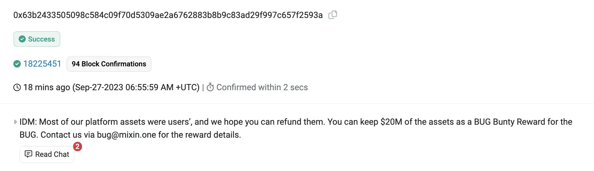据派盾 peckshield 监测,Mixin 在链上对黑客留言表示,Mixin 平台上的资产绝大部分都是用户的资产,希望攻击者可以归还盗取的资产。若攻击者选择归还资产,则可留下 2000 万美元作为漏洞赏金,并通过 bug@mixin.one 与 Mixin 联系了解奖金细节。