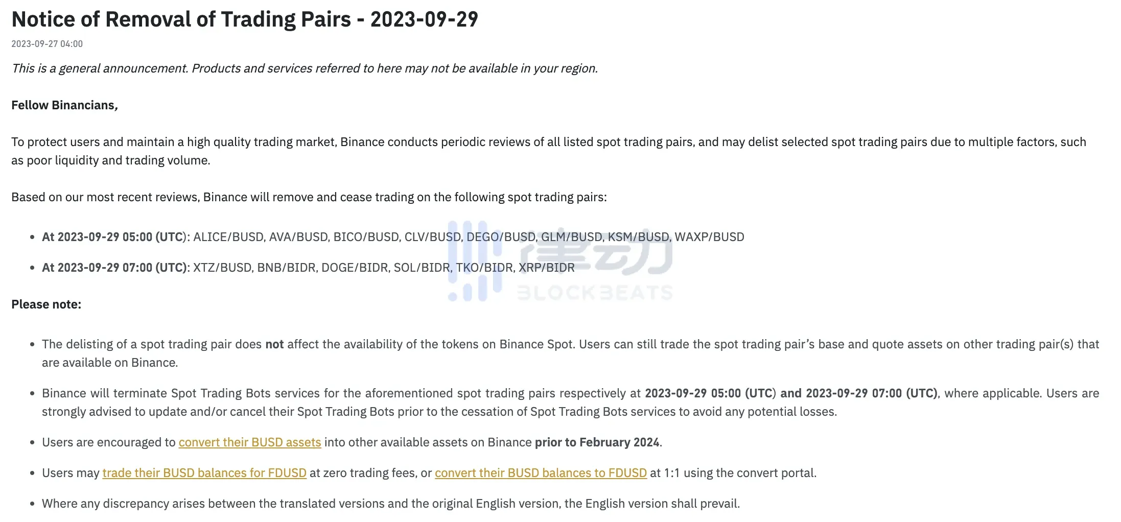 Binance 将移除 ALICE/BUSD、AVA/BUSD 等现货交易对并停止交易