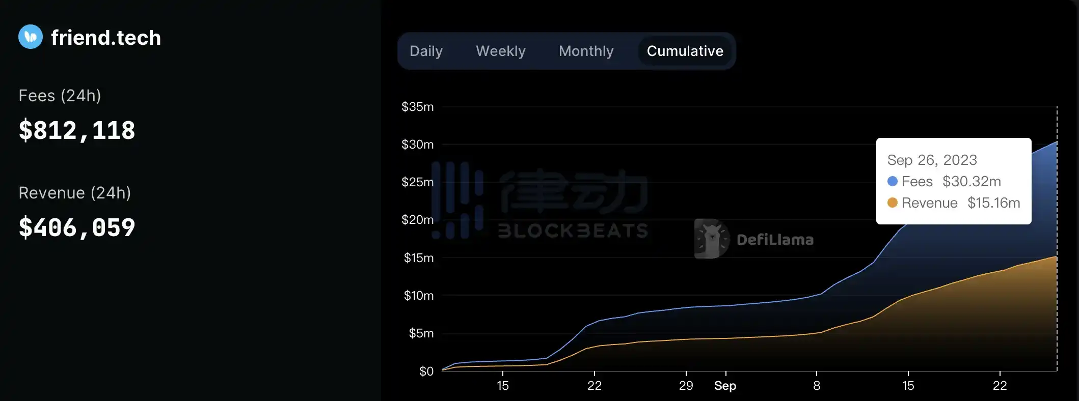 据 DefiLlama 数据显示,friend.tech 协议费用已超 3000 万美元,达 3032 万美元。协议收入已超 1500 万美元,达 1516 万美元。