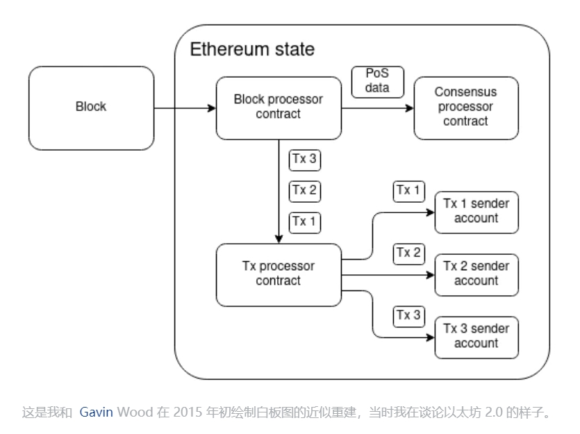 「状态转换函数」(处理区块的函数)将只是单个 VM 调用,所有其他逻辑将通过合约发生:一些系统级合约,但主要是由用户提供的合约。这个模型的一个非常好的功能是,即使是整个硬分叉也可以被描述为对于区块处理器合约而言的单笔交易,该交易将通过链下或链上治理进行批准,然后以升级的权限运行。
