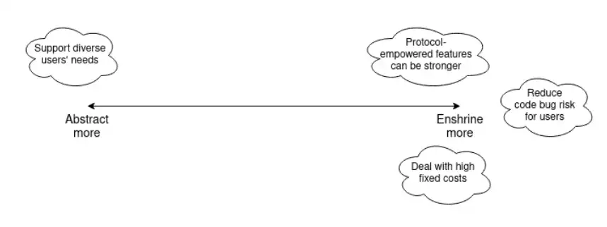 通常,保持基本协议的最小化和简单性会将复杂性推到一些协议之外的生态系统。从 Unix 哲学的角度来看,这很好。然而,有时存在协议外生态系统将中心化的风险,通常(但不仅仅是)因为高固定成本。封装有时可以减少事实上的中心化。