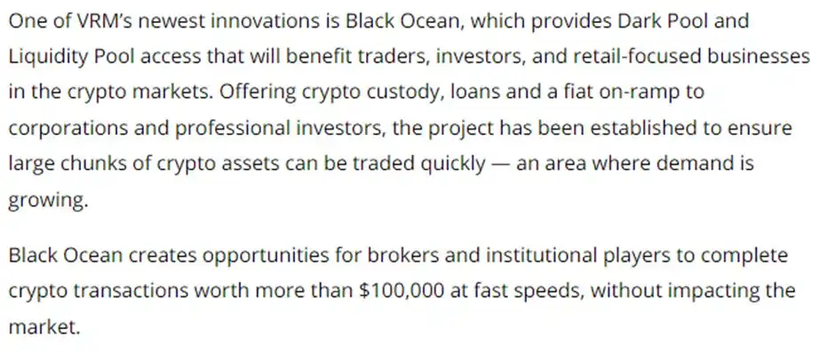 VRM 团队还创建了他们自己的OTC 交易平台 Black Ocean。