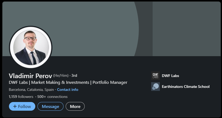 Grachev 还领导了一个名为 Export.online 的可疑项目,该项目原计划进行 ICO,但由于 2018 年的熊市而不得不取消。一些项目投资者报告说 Grachev 挪用了他们约 157,000 美元的投资。根据 LinkedIn 资料显示,Andrei Grachev 是这个组织的首席执行官,Vladimir Perov 是首席技术官。Perov 现在也在 DWF Labs 工作。