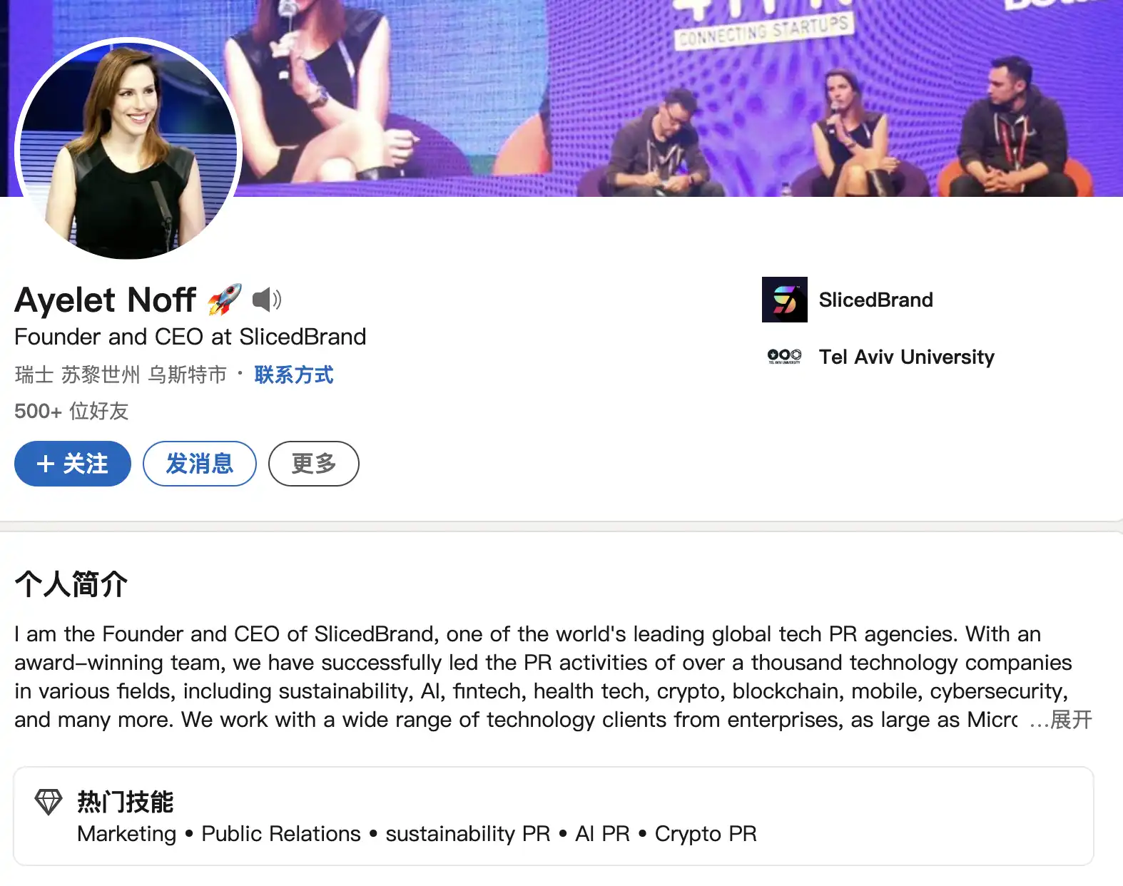 2023 年 3 月 20 日,DWF Labs 向一个钱包发送了 750 万美元的 USDT,这个钱包之前向在 OpenSea 上标记为「AyeletNoff」的钱包发送了 16.3 万美元。Ayelet Noff 是一家公关公司 SlicedBrand 的创始人和首席执行官。