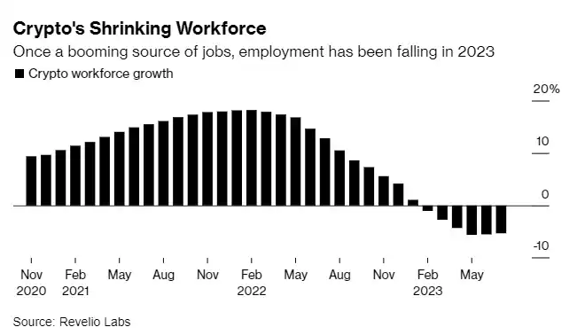 至关重要的是,风险投资界以前宽松的腰包已经大大收紧。根据 Pitchbook 的数据,今年截至 9 月 19 日,针对加密货币和区块链项目的风险投资交易总额约为 73 亿美元,相当于 2021 年和 2022 年全年总额的四分之一。而且这个行业的就业机会正在减少。根据 Revelio Labs 的数据,根据 35 家大型公司的数据,虽然 2022 年初加密货币行业的劳动力增长速度超过 18% ,但就业机会在整个年度一直在下降,而最近的下降率超过 5% 。
