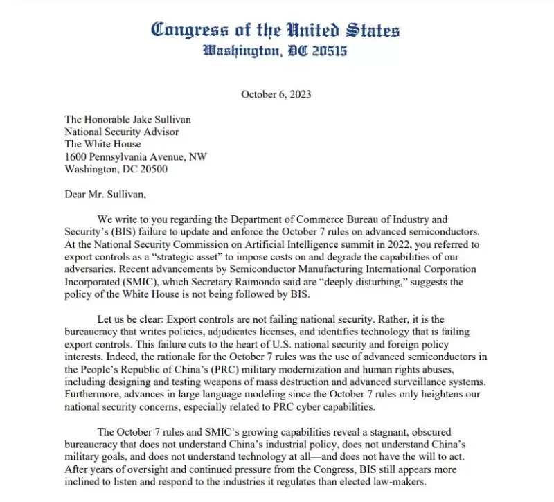 麦考尔和加拉格尔在信中表示:“10月7日出台的规则和中芯国际不断扩大的能力体现了一种惰性和不透明的官僚体系,该体系缺乏对中国产业战略的洞察力,无法理解中国的军事目标,并且在技术理解方面表现出缺陷。此外,它似乎缺乏采取有效行动的决心。”