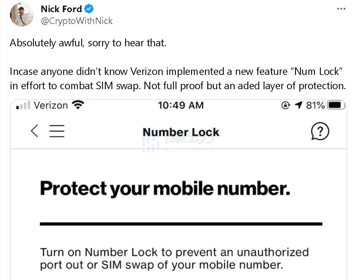 去年 1 月,Verizon 在 LinkedIn 上发布的合作伙伴经理招聘信息显示,该公司计划进军 NFT、Web 3 和元宇宙等领域。针对此次 SIM 卡交换事件,@CryptoWithNick表示,Verizon 实施了一项新功能「Num Lock」来对抗 SIM 卡交换。