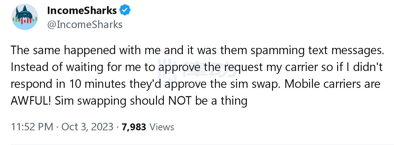 此事也引发了社区激烈评论,其中 @IncomeSharks 发文表示,「同样的事情也发生在我身上,那些人先给我发送垃圾短信。因为运营商不会等待我批准该请求,因此如果我在 10 分钟内没有回复,他们就会批准 SIM 卡交换。移动运营商太糟糕了!Sim 交换不应该成为问题。」