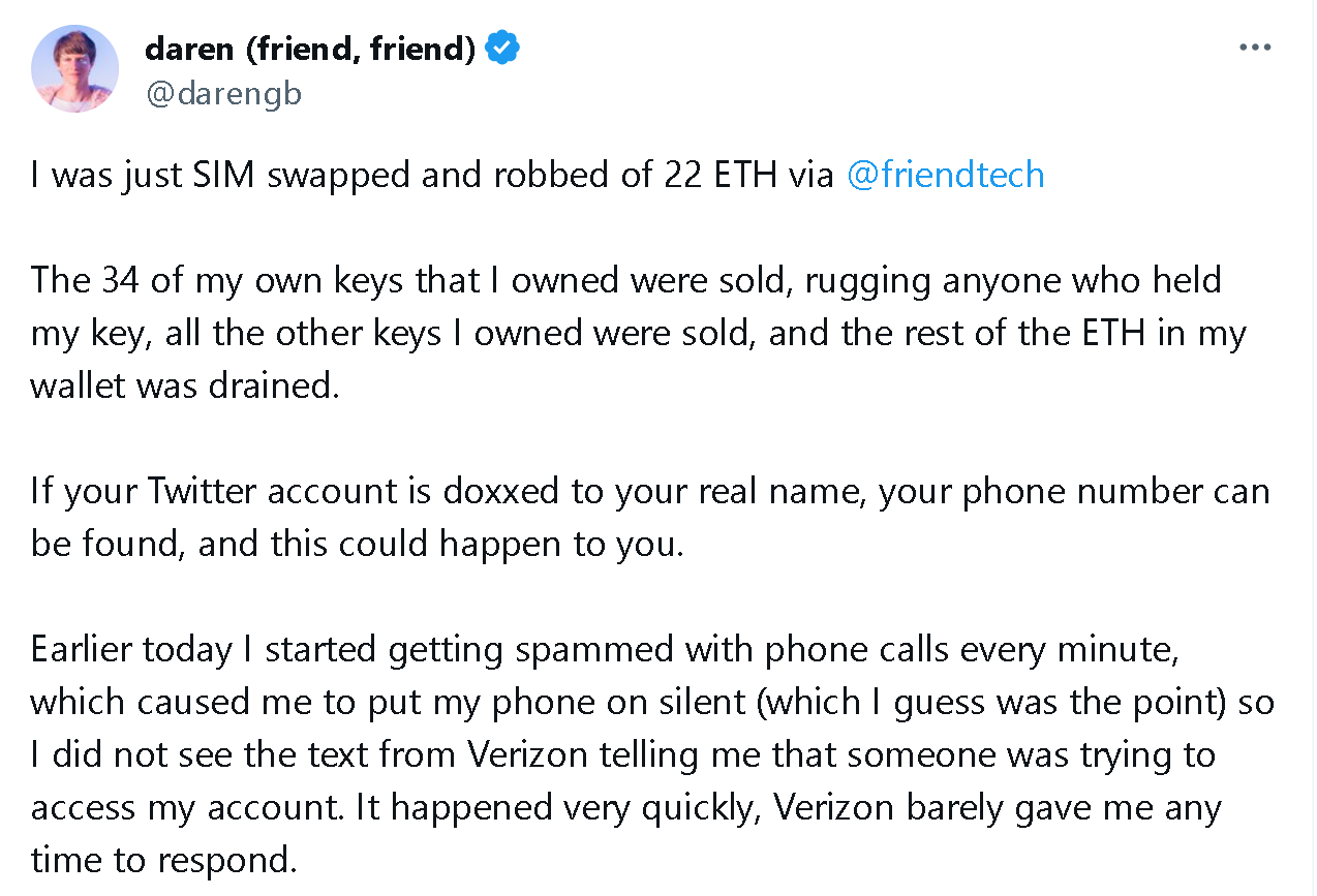 friend.tech用户遭SIM Swap攻击,Verizon短信验证是安全漏洞?