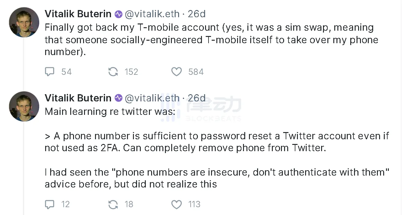 SIM 卡的调换引起损失似乎并不是新鲜事, 曾于 9 月 10 日报道,以太坊联创 Vitalik 的推特账号被黑客攻击并发布钓鱼链接。据 ZachXBT 表示,黑客共计盗走约 69.1 万美元。9 月 12 日,Vitalik 在社交媒体上发文表示,已经找回其 T-mobile 帐户,并确认此前的攻击是一次 SIM 卡交换攻击。