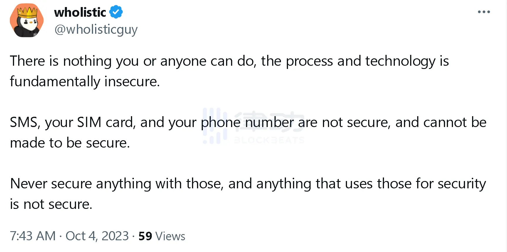 然而,社区成员仍然对此表示质疑,@wholeisticguy 发文表示,「流程和技术从根本上来说是不安全的,任何人都无法为此做出保证。短信、你的 SIM 卡和你的电话号码并不安全,也无法保证安全。永远不要用这些来保护任何东西,任何使用它们来保证安全的东西都是不安全的。」