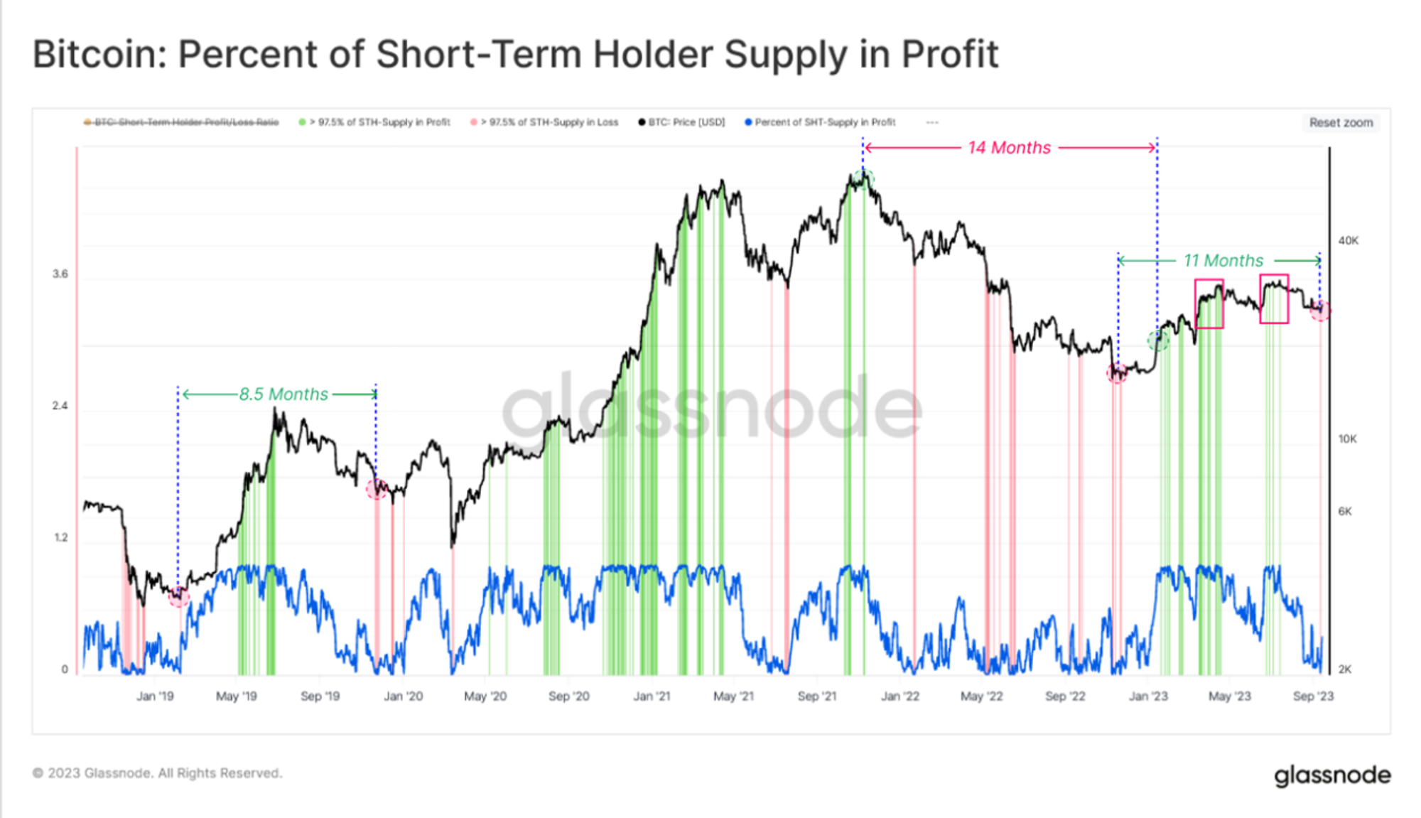 从上图可以观察到,经历将近 11 个月的市场修整,大约 97.5% 以上的短线 BTC 筹码都处于浮亏中,从$30,000 一线跌到$25,000 一线看似绝对跌幅并不巨大,但是割肉抛盘的痛感程度其实非常剧烈,这个级别的市场出清应该可以换来 1 个月左右的市场冷静期。
