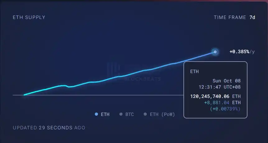 以太坊年通胀率升至 0.385%,过去 7 日通胀 8881.04 枚
