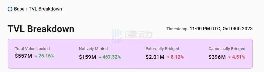 据 L2BEAT 数据显示,过去一周 Base 网络 TVL 增长 25.16%,达 5.57 亿美元。其中原生资产铸造价值增幅达 467.32%。USDC 为 Base 网络主要原生资产,其当前在 Base 网络已发行 1.59 亿美元。