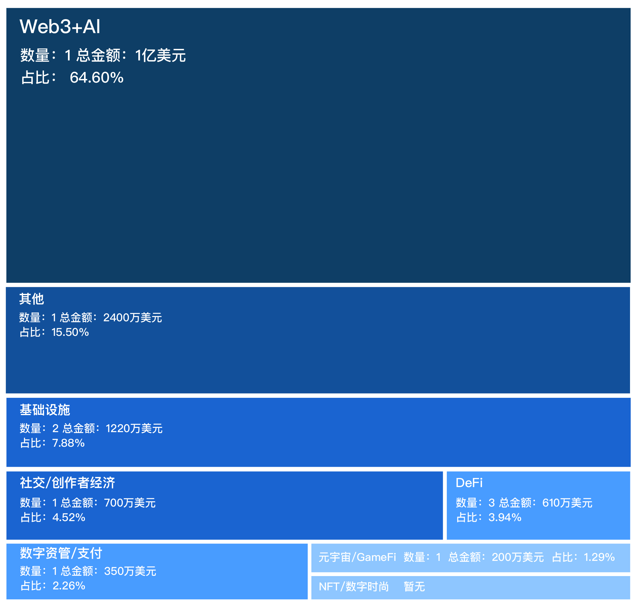 在 Web3+AI 领域共计 1 笔融资,总金额超 1 亿美元,占上周融资总额的 64.6%。