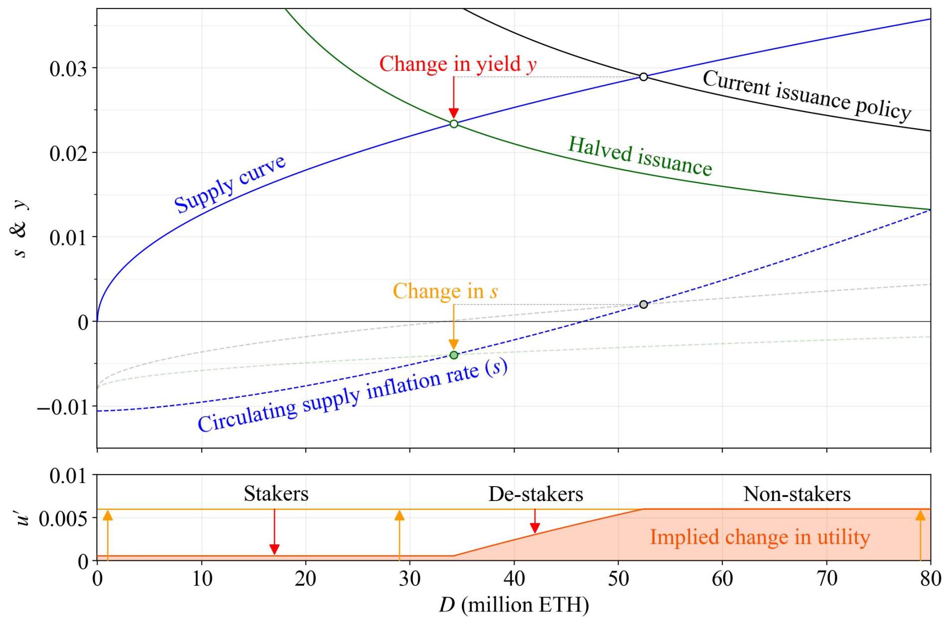 持有者的预留收益率可以被描述为「无差异点」,在这个点上,他们从质押中获得的效用等同于不质押。这意味着降低发行量实际上可以提高每个人的效用,即使是质押者,只要以太坊仍然可靠安全。